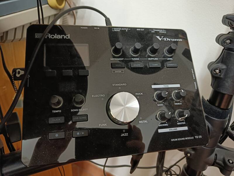 Vendo batteria roland td25kv usata ma in ottime condizioni, comprensiva di pedale per cassa, hardware hi-hat, sgabello e cuffie. Come da fotografia...