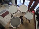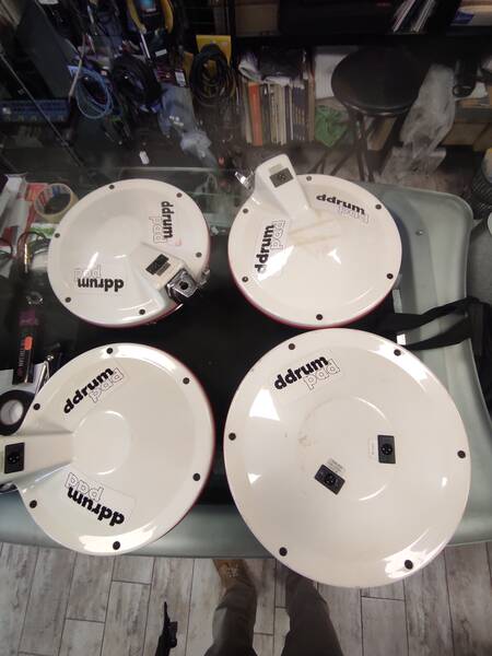 Compresa di rack cromato con 2 tom pad ddrum 10" serie 2 + 1 pad rullante 12" tutti con pelli mesh nuove +Pad Cassa Ddrum serie2 +relativi attacchi su rack+ cavi di cablaggio, senza piatti , tutto in buonissimo stato, perfetta.