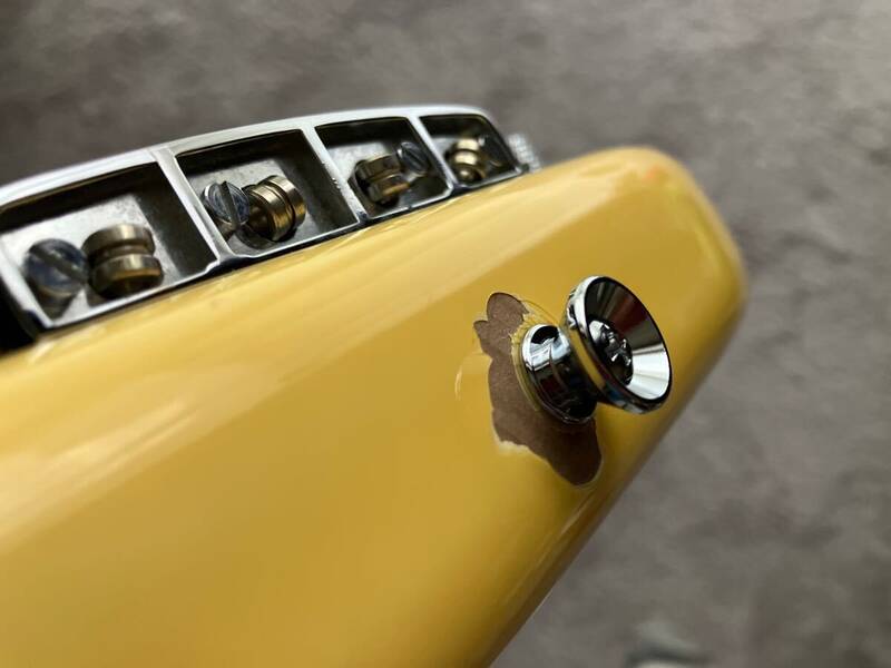 Sono stati sostituiti tutti e tre i potenziometri e il cablaggio interno e tutte le parti metalliche, compresi i tasti, sono state lucidate con un composto molto fine. La tastiera è stata pulita e oliata. Il puntale di bloccaggio, che presentava parti mancanti, è stato sostituito con un nuovo pickup in stile Fender. I pickup sono stati revisionati e sono simili ai DiMarzio.