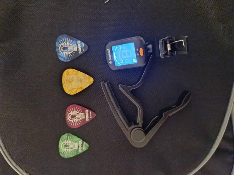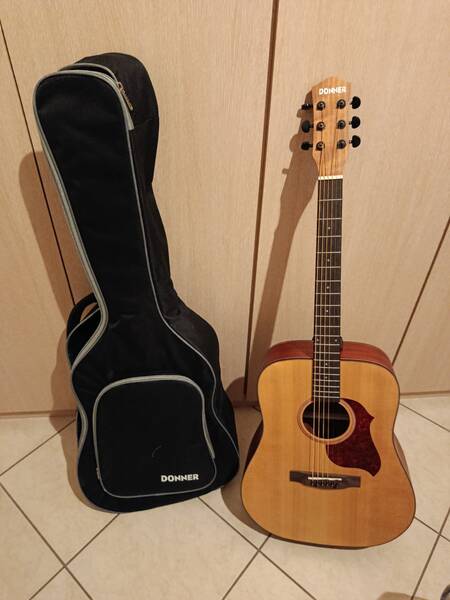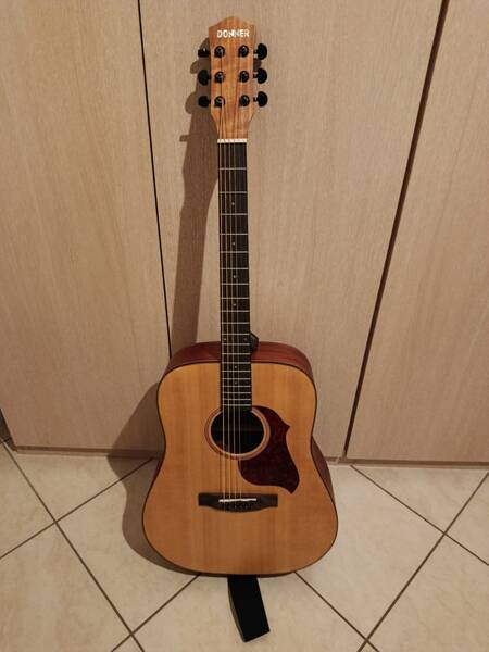Vendo chitarra acustica donner nuova acquistata da pochi giorni con 2 anni di garanzia, 6 corde in acciaio, dimensioni dreadnought 41 pollici di colore naturale in legno di mogano e abete Sitka in superficie, orientamento mano destro,sistema ponte chitarra fisso