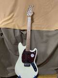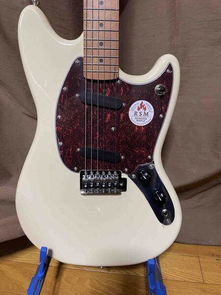 Ricorda molto una Mustang nella forma e nel setup. Manico in acero roasted, due pickup single coil, ponte tremolo (leva presente), tono, volume e selettore a tre vie.