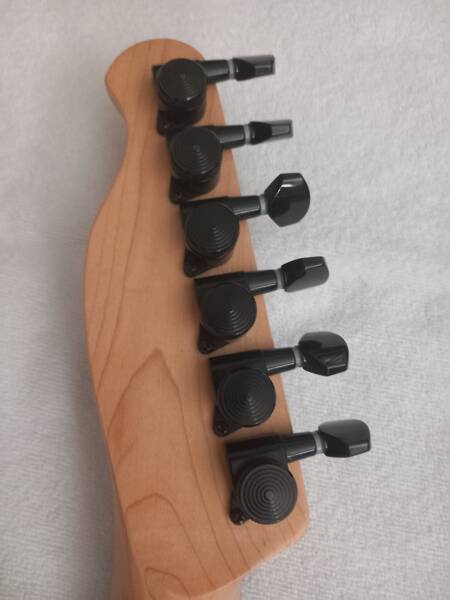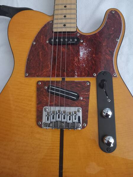 Manico e tastiera in acero, con binding nero, corpo in frassino americano con top in acero fiammato con binding nero e striscia in noce.